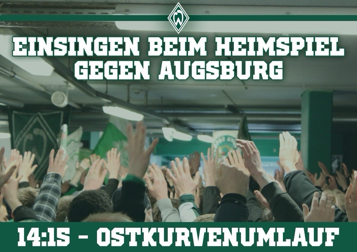 Vor dem Heimspiel gegen den FC Augsburg werden wir uns erneut im Ostkurvenumlauf einsingen. Wir haben in den Spielen der letzten zwei Wochen ein wenig Luft bekommen, gerettet sind wir jedoch noch nicht. Umso wichtiger ist es gegen Augsburg die nächsten Punkte einzufahren und den Klassenerhalt fest zu machen. Lasst uns nochmal alles geben und die gewonnene Energie mit in die Ostkurve tragen: